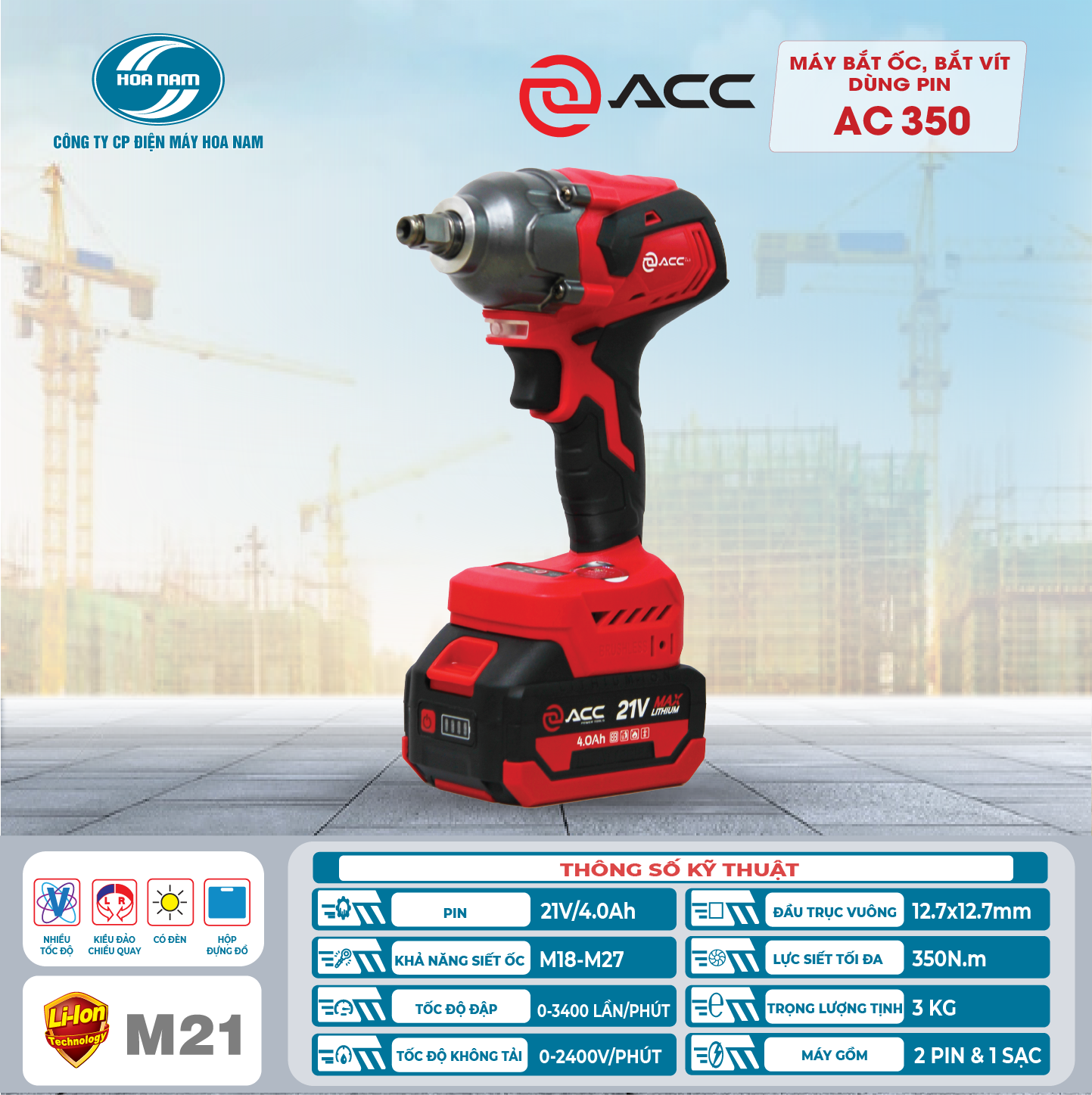 Máy bắt ốc bắt vít dùng pin AC350 đến từ thương hiệu ACC là một trong những thiết bị không thể thiếu trong ngành cơ khí, sửa chữa và lắp ráp. Với công suất mạnh mẽ, thiết kế bền bỉ và nhiều tính năng ưu việt, máy giúp tối ưu hóa hiệu suất làm việc, tiết kiệm thời gian và công sức đáng kể.
