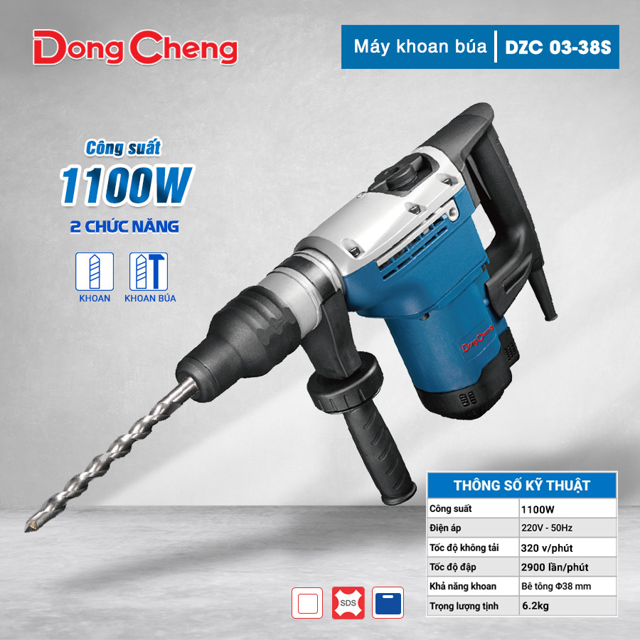 - Công suất mạnh mẽ 1100W: Máy khoan búa DZC03-38S có công suất lên tới 1100W, cho khả năng làm việc ổn định và mạnh mẽ, dễ dàng khoan và đục các vật liệu cứng như bê tông, gạch, đá. Với công suất này, máy đảm bảo hiệu quả công việc cao, tiết kiệm thời gian và sức lực.