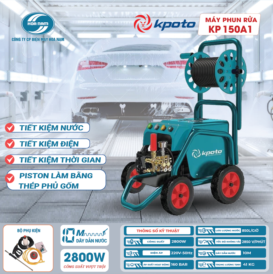Máy phun rửa KP150-A1 là thiết bị chuyên dụng dành cho tiệm rửa xe, nhà xưởng và công trình xây dựng, đáp ứng nhu cầu làm sạch nhanh chóng và hiệu quả. Với công suất 2800W, áp suất phun 160 bar cùng lưu lượng nước 850 lít/giờ, sản phẩm mang đến khả năng phun rửa mạnh mẽ, giúp loại bỏ bụi bẩn cứng đầu dễ dàng.